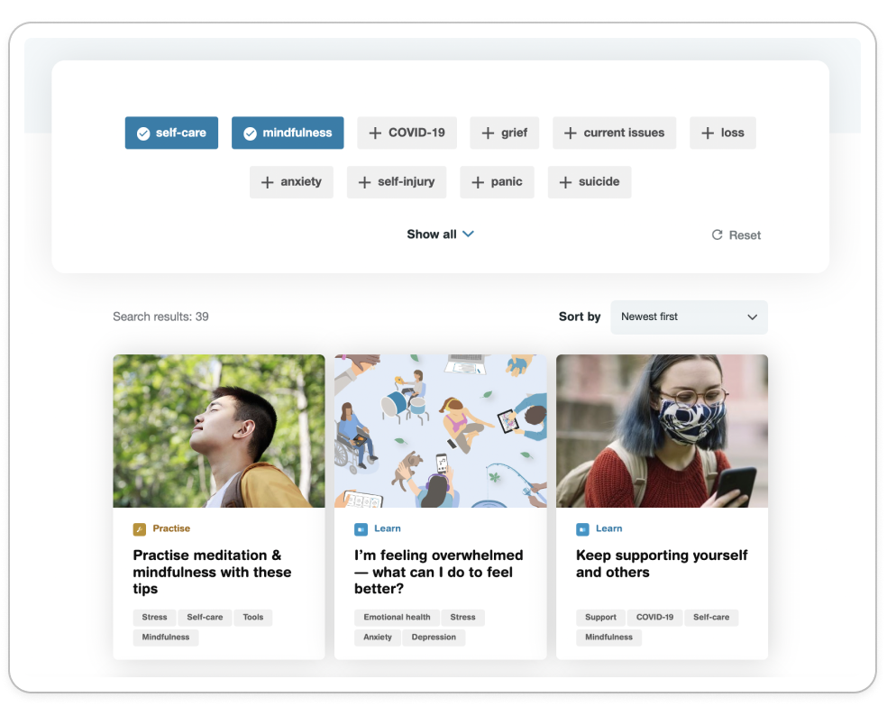 La nouvelle passerelle s'attaque à ces obstacles en offrant une expérience utilisateur plus personnalisée et empathique. Des fonctions comme le nuage de mots-clés permettent aux utilisateurs de filtrer les ressources facilement et rapidement, afin qu'ils puissent trouver ce qu'ils cherchent dans les quelques secondes qui suivent leur arrivée sur le site. Dans la nouvelle barre de navigation, des tuiles de service ouvrent la voie à chacun des différents types de soutien offerts par Jeunesse, J'écoute, organisés selon le continuum de soins progressifs : ressources éducatives, activités pour aider les jeunes à développer leurs compétences, communautés soutenues par des pairs, et plus encore.