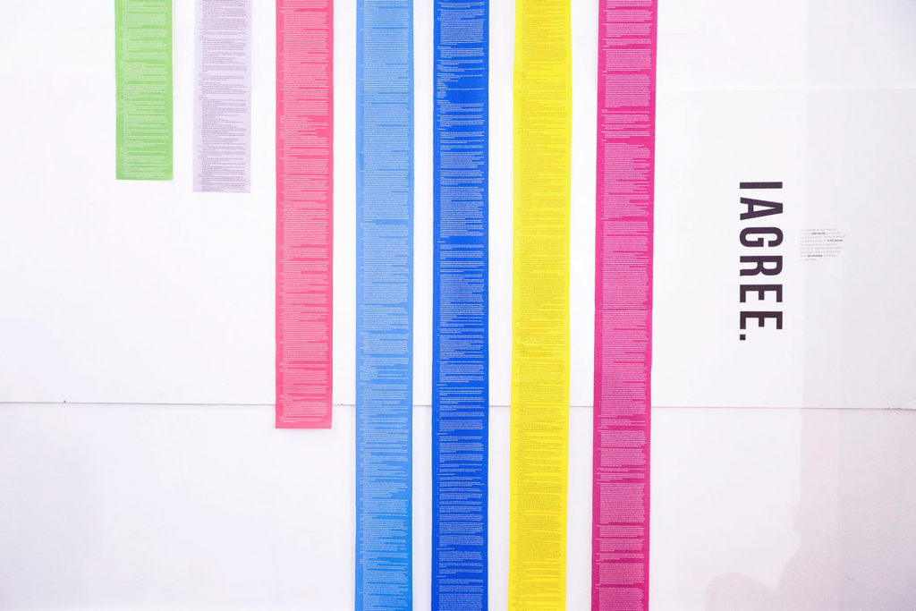 Vous êtes-vous déjà demandé quelle était la longueur réelle des conditions et politiques publiées par les principaux services en ligne ? L'artiste Dima Yarovinsky l'a fait, et les a même transformées en un projet artistique percutant1. Le résultat : les parchemins en technicolor illustrés ci-dessous, qui descendent le long du mur et (dans certains cas) s'étalent sur le sol.