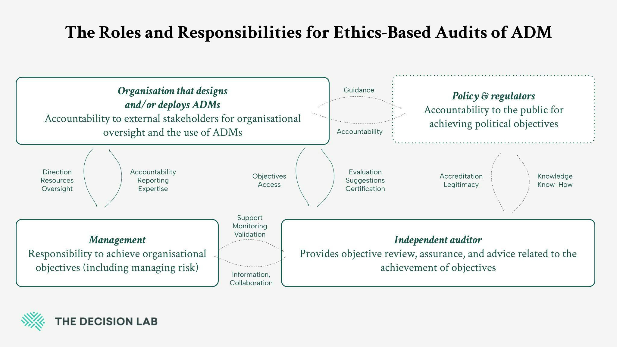 While we’ve captured some of the core ethical challenges with ADM, they are just some of the key areas where guidelines are needed. As a versatile solution to potential issues, researchers suggest that ethics-based auditing may be a feasible way to support the governance of organizations that are using ADM to make high-stakes choices.1 Ironing out ethical regulations, ensuring ADM systems abide by them, and earning the trust of stakeholders is no small feat. To simplify this solution, we can visualize the dynamics as a series of relationships and paths of information exchange between organizations and human agents:1