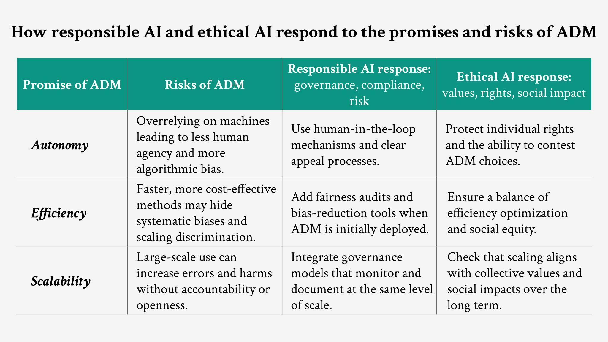 At the crux of ADM, there are promises of autonomy, efficiency, and scalability for solving complex problems. The paradox of these qualities is that they may magnify harms if we don’t analyze the ethics of automated processes. It is important to recognize possible trade-offs between efficiency and fairness, as well as consistency and trust. For these reasons, ethical scrutiny of ADM and AI systems is necessary to ensure they strengthen ethics in institutional and organizational decision-making.11