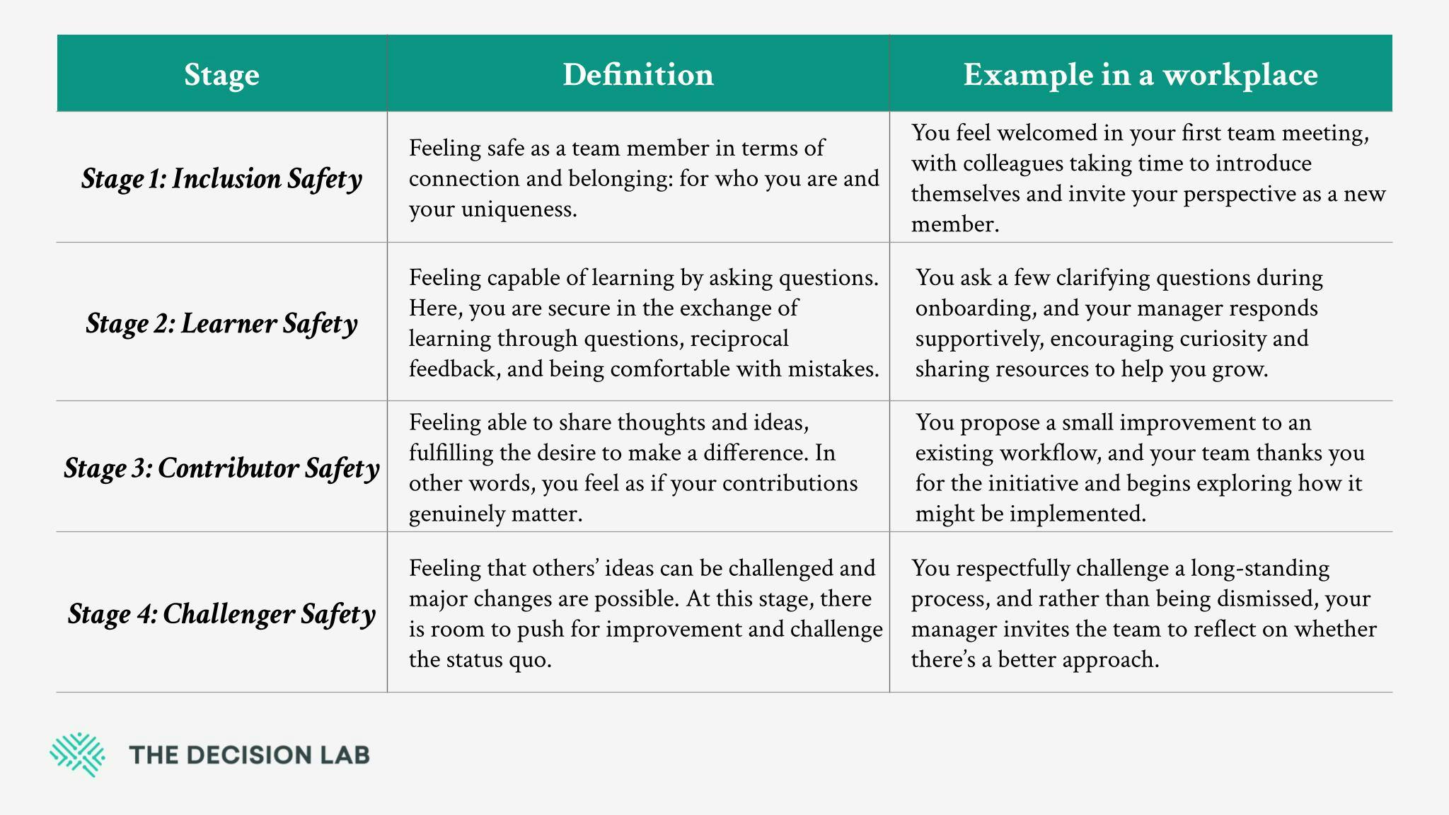 Aside from involving all team members in implementing psychological safety, it is crucial to integrate it through concrete stages, with the basis of feelings of belongingness.2 The building blocks of psychological safety and its presence are spelled out in the four stages of psychological safety.1, 2Developed by psychologist Timothy Clark,the four stages of psychological safety are inclusion, learner, contributor, and challenger safety. These stages describe the journey from feeling accepted to feeling safe enough to challenge the status quo. Each stage builds one’s confidence to engage, grow, and speak up without fear of embarrassment. Let’s take a closer look at these stages and some tangible examples: