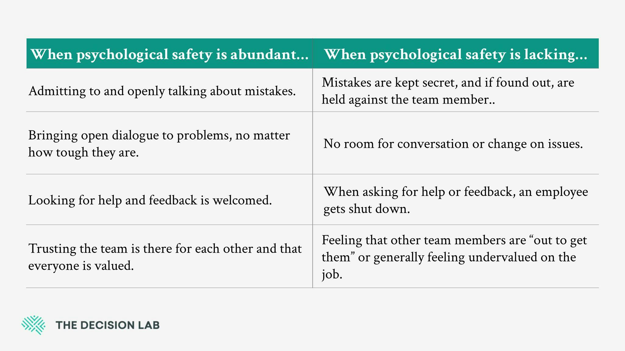 Psychological safety is not as simple as “everyone is nice.” Instead, it is felt when individuals feel they can brainstorm thoughts, challenge conventions, give feedback, and actively disagree.2 It is important to distinguish psychological safety relative to what a high amount of trust at work looks like. A key difference between these concepts is that psychological safety explains how beliefs and values define group norms, while trust emphasizes the beliefs that people have about each other.1 True psychological safety emerges when everyone feels they know that others will perceive their ideas, questions, worries, and errors in a non-judgmental way. Here are a few indicators of when psychological safety is present or absent: