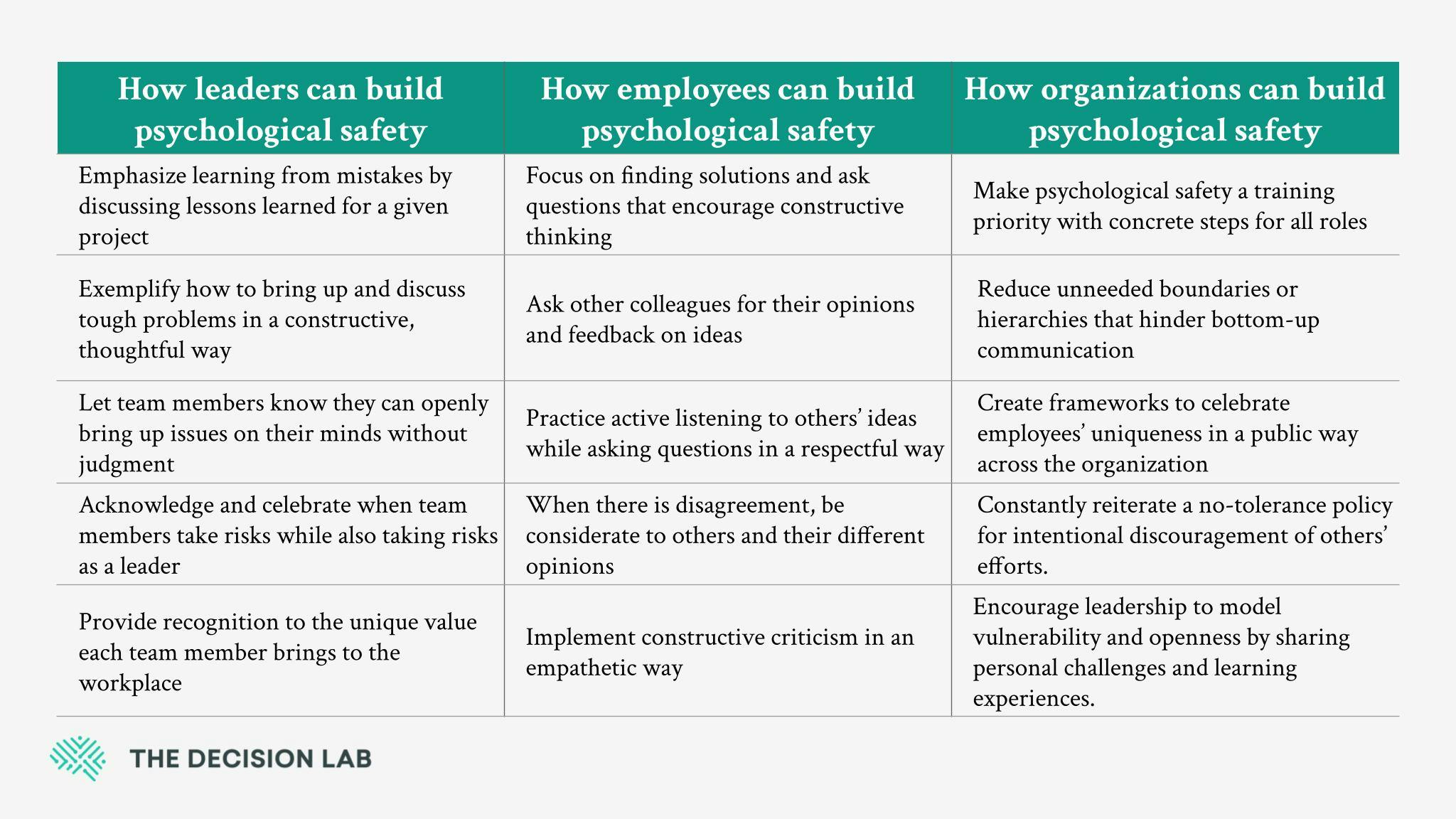 Psychological safety is a team effort, not just an individual one. Reflecting on how it is distinct from trust, which involves how one employee perceives another, psychological safety is about defining group membership and how it feels to be a part of a team, through open communication. Psychological safety is not something that merely goes downstream from management to employees. Rather, leaders, employees, and the organization itself must all be proactive in the process of fostering genuine psychological safety by mutual empathetic listening. Let’s take a closer look at how both leaders and employees can grow psychological safety while the organization can further support this initiative for a healthy work culture:3